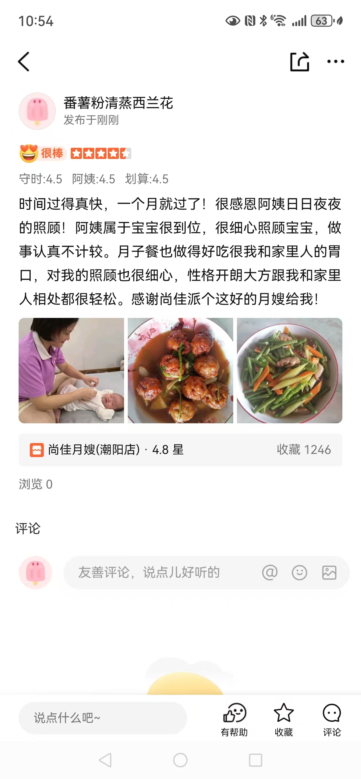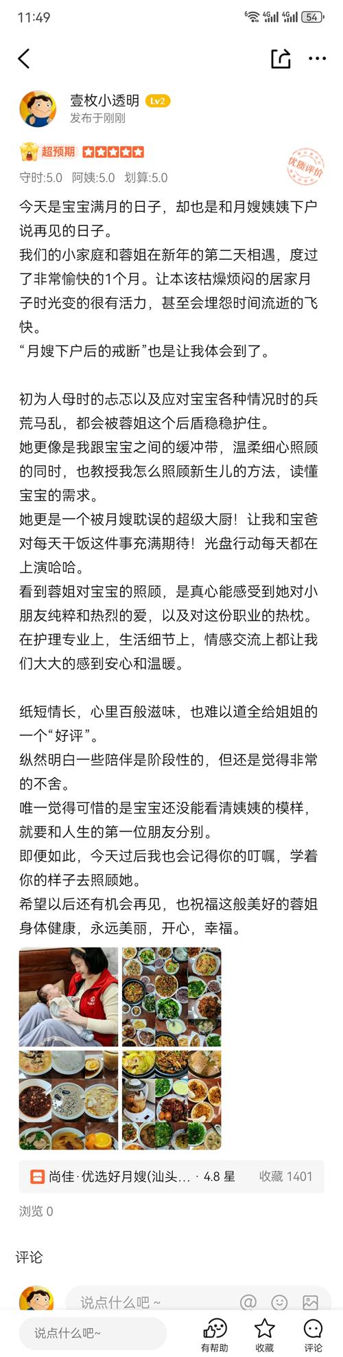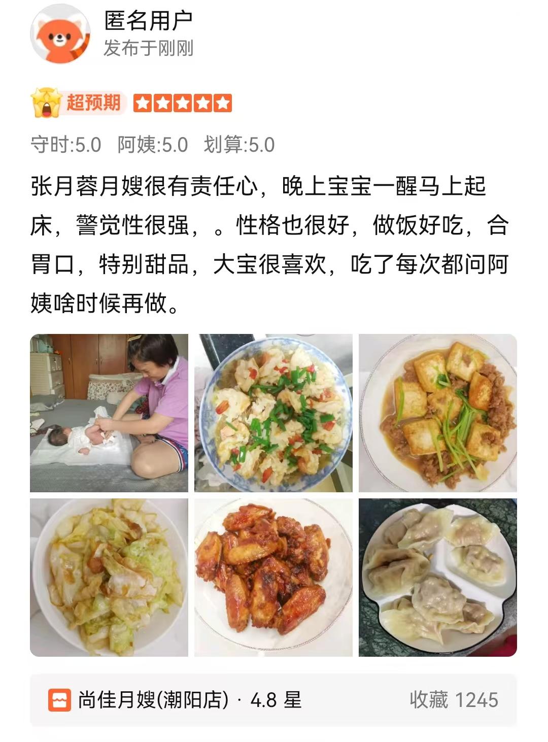 蓉姐很好相处,平易近人,做事细致周到,工作方面擅长:母婴护理、婴儿抚触等,工作时带过双胎,早产,试管婴儿!菜品方面擅长做月子餐,粤菜,甜食等。